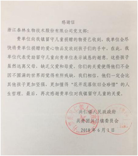 7月初,黨支部收到了興仁鎮(zhèn)兒童寄來的感謝信,信中表達(dá)了對泰林生物黨支部為他們帶去關(guān)懷與祝福的誠摯感謝。